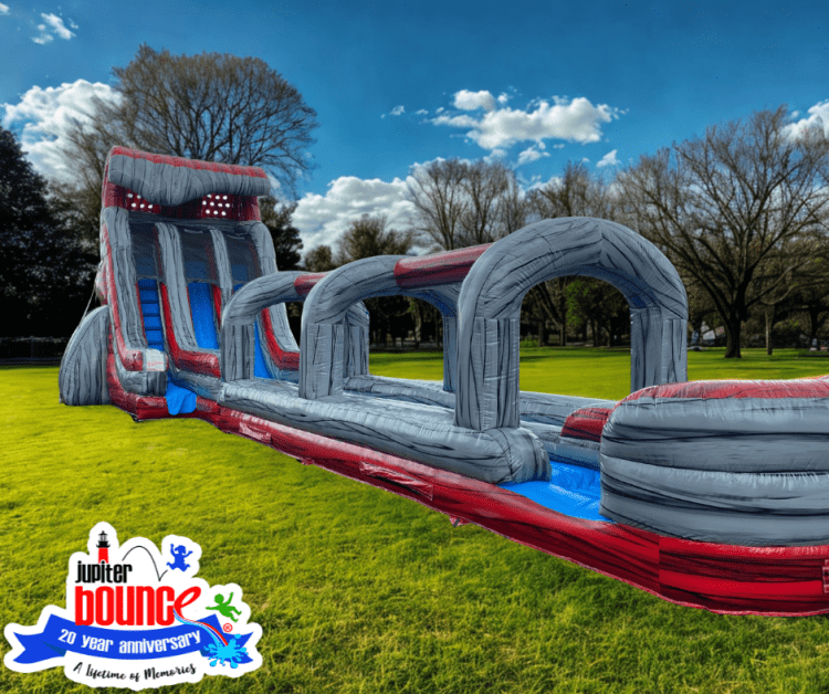Looking for a super cool water slide that stands out from all the palm trees and bright colors? The NEW Captain's Revenge is exactly what you need! It features a huge double lane slide with an extended slip n slide into a deep pool. It is perfect for adventurous elementary schoolers, preteens, teens, and adults to race down. This inflatable water slide is a fun activity to keep everyone entertained for hours. Explore the roaring seas on the 25' Captains Revenge Slide! Get back your stolen loot by sailing down the slide!